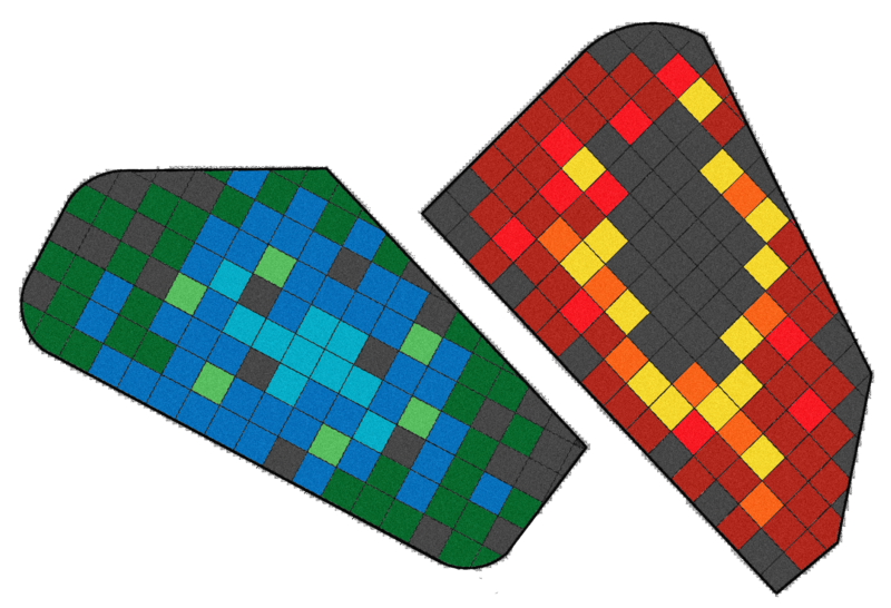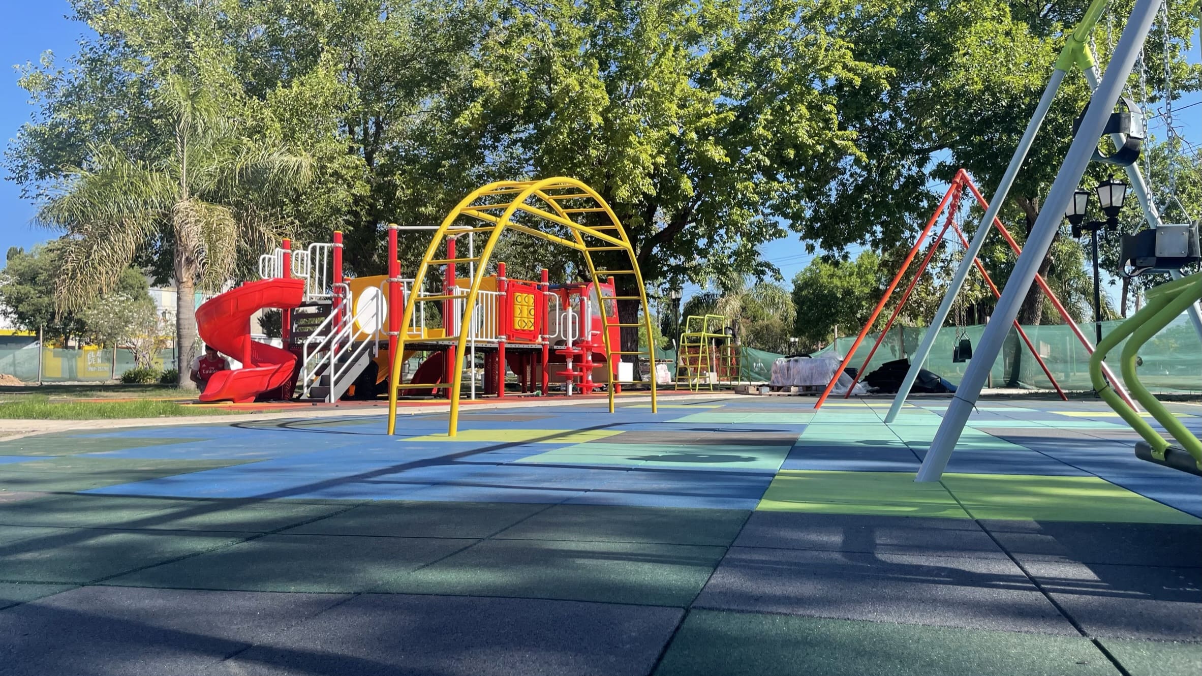 Diseñamos esta plaza con dos sectores temáticos: uno de bomberos, con baldosas rojas y amarillas que evocan el fuego, y otro de agua, con tonos celestes y verdes que transmiten frescura. Ambos espacios fueron realizados con baldosas de caucho reciclado, que además de aportar identidad y color, garantizan seguridad y amortiguación para el juego.